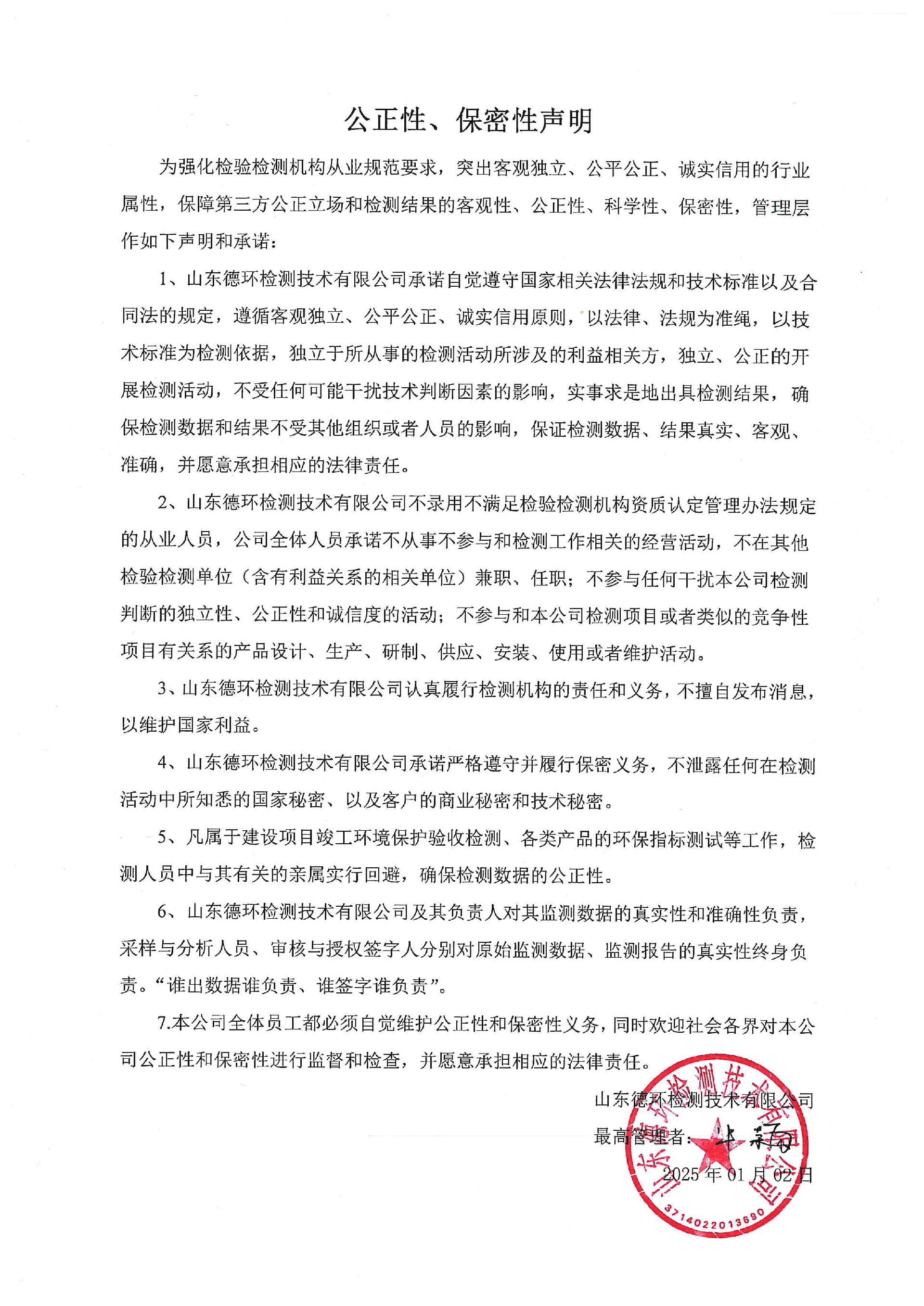 山東德環(huán)檢測(cè)技術(shù)有限公司公正性、保密性聲明